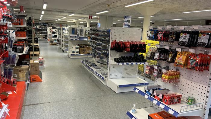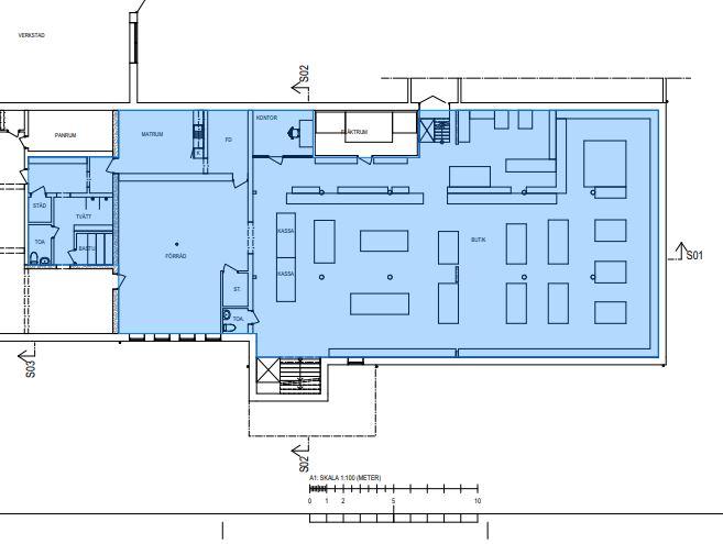 Öppen och anpassningsbar lokal en halv trappa ner. Lokalen nyttjas idag som butik. Personalutrymmen med omklädning och bastu. Varuhiss och personhiss finns.
