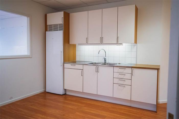 Lokalen har en praktisk kokvrå med utrymme för ett fikabord, lämpligt för luncher och pauser. Från det stora rummet finns dessutom tillgång till en balkong.