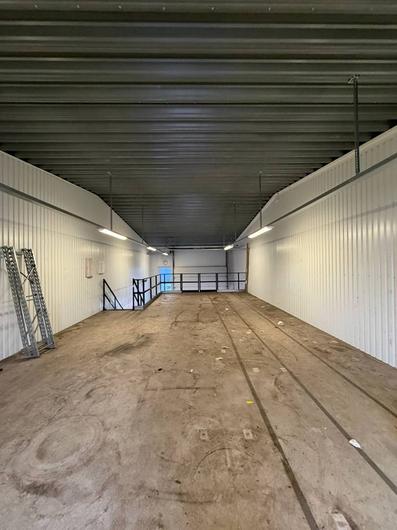 Planlösning:Öppen lageryta med bra takhöjd och fria ytor för förvaring. Entresol längs ena sidan med trappa upp, lämplig för lager eller enklare kontor. Enkel och funktionell planlösning med bra flöde.