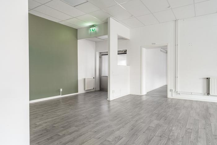 Lokalen är idag uppdelad i två öppna ytor, med tillhörande WC och pentry. Det finns goda parkeringsmöjligheter, egen entré via framsidan och på baksidan av lokalen finns en större dörr för in- och urlastning.
