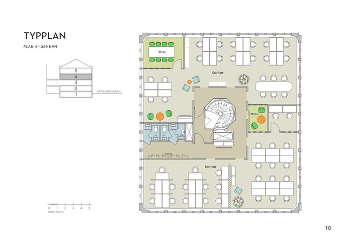 Här får ni fyra plan med kontor på sammanlagt 1 183 kvm samt ett källarplan på 299 kvm. Ett eget hus på totalt 1 482 kvm. Planlösningen är mestadels öppen och det finns fönster runtom hela byggnaden. Det ger en ljus och härlig miljö både för kontor och mötesplatser. Och stora möjligheter för er att få ett eget hus som näst intill i minsta detalj är i linje med era önskemål.