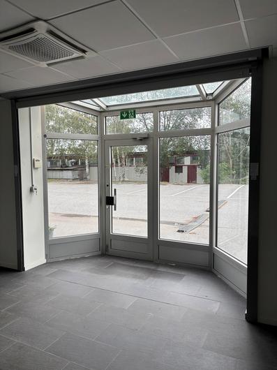 Kontorsdelen har dessutom en separat kundentré med jalusi, vilket gör lokalen särskilt lämplig även som servicelokal, exempelvis för hämtningsservice, kundmottagning eller annan serviceinriktad verksamhet.