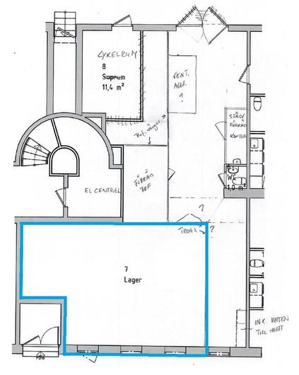 På utsidan sitter en dubbelport om ca 2,60 M bred och ca 2.32 M hög. Innanför denna kommer ett nytt ventilationsaggregat att installeras vilket förser lokalen med luft. Innanför ventilationsaggregatet kommer föreningen att bygga ett mindre förråd för eget bruk. Innanför föreningens förråd kommer en lokalavskiljande vägg med port att byggas vilken avgränsar lokalen. Se ritningen i annonsen för tydliggörande.