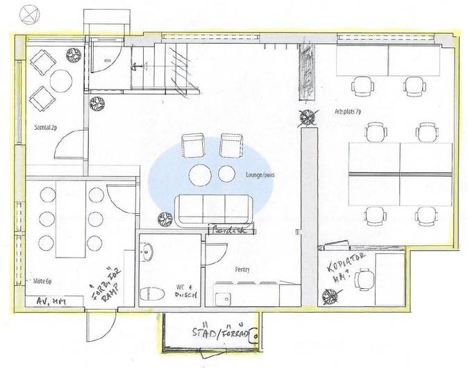 Lokalen byggs upp från grunden med den planlösning som ritningen i annonsen visar. Lokalarean fördelas fyra rum, två kontorsrum som kan inredas som kontorslandskap samt två tänkta som mötes- respektive samtalsrum. Ett nytt pentry kommer att utrustas med 2 mikrovågsugnar och diskmaskin. I WC kommer en dusch med vikväggar att installeras och det kommer att bli en vägghängd toalett. Längst in i lokalen finns ett litet förråd/maskinrum och i en anslutande lagerlokal byggs ett städförråd.