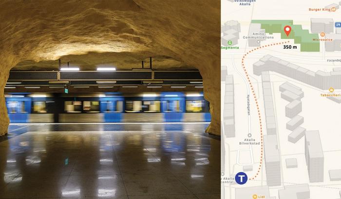 Kontoret ligger ca 350 meter från Akalla tunnelbanestation och det tar 20 minuter från T-Centralen. T-banan förlängs norrut till Barkarby station med tillgång till pendeltåg (2026) och till Nacka och Hagsätra söderut (2030).