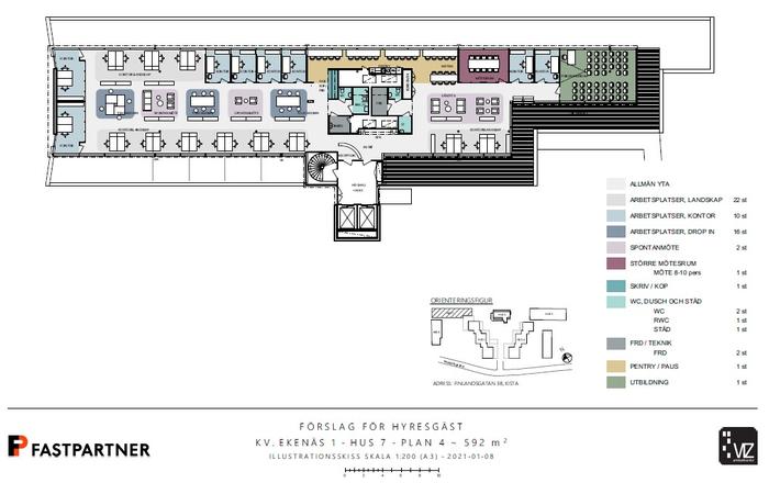 Lokalen är uppdelad i fem våningsplan som alla omges av glaspartier som skapar ljus och rymd vilket ger en härlig kontorsmiljö att verka i. Den uppglasade entrén i markplan välkomnar personal och besökare in i en stor entrélounge med bemannad reception och där du också har tillgång till en mängd conciergetjänster. Här finns en generös extern mötesdel med konferens- och mötesrum i varierande storlekar med tillhörande ytor för paus. I markplan finns även en hörsal med 150 platser och en restaurang och café. Här finns även fullutrustat gym med bastu, pingis och yta för innebandy, fotboll etc. Gyminstruktör en gång per vecka. De övre våningsplanen utgörs av öppna kontorslandskap kring mittkärnor med mindre samtals- och mötesrum, serviceytor, kaffestationer och wc-grupper. Den öppna planlösningen skapar stor flexibilitet, där skrivbordplatser kan varieras med exempelvis projektytor och spontanmöten.