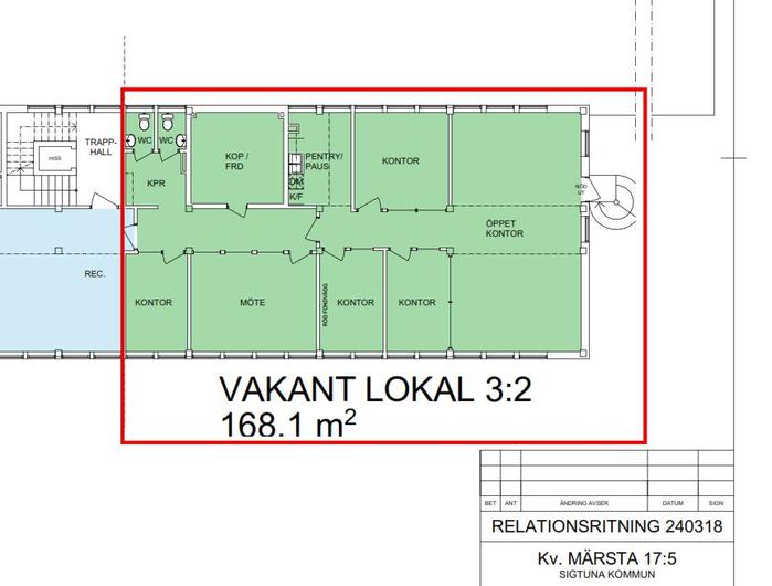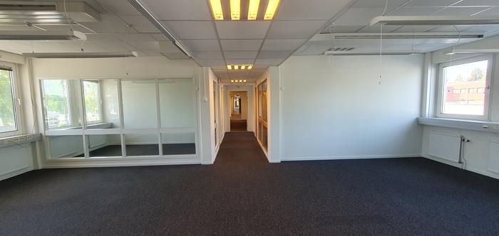 Kontorslokal en trappa upp i fastigheten. Lokalen har fönster i tre vädersträck.