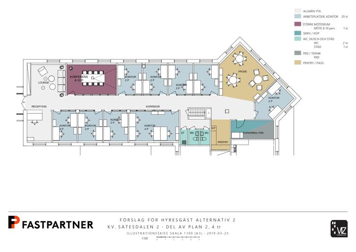 Befintlig planlösning är rumsindelad med sammanlagt 8 kontorsrum, två konferensrum, mötestum och trevliga loungeytor.