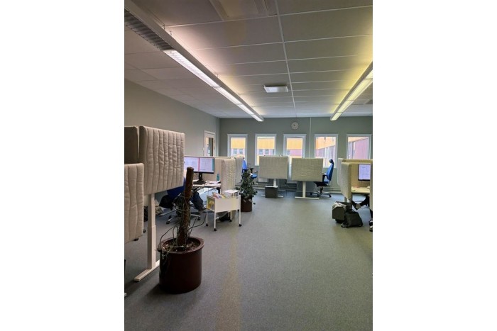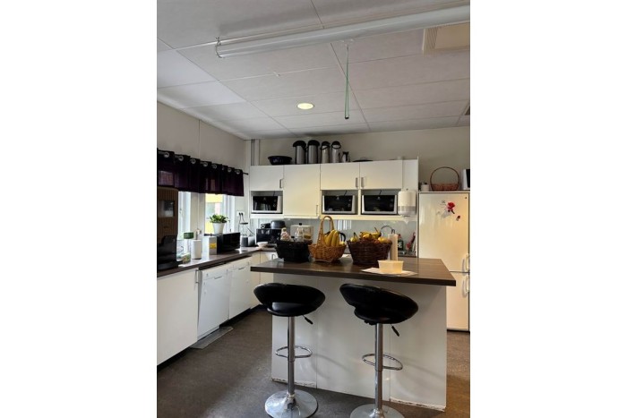 Kontorsdelen ligger direkt ovanför lagret och där finns flera rum i varierande storlek. Här finns plats för både kontorsplatser, mötesrum och personalutrymmen. Lokalerna har bra ljusinsläpp och fastigheten erbjuder gott om parkeringsplatser.
