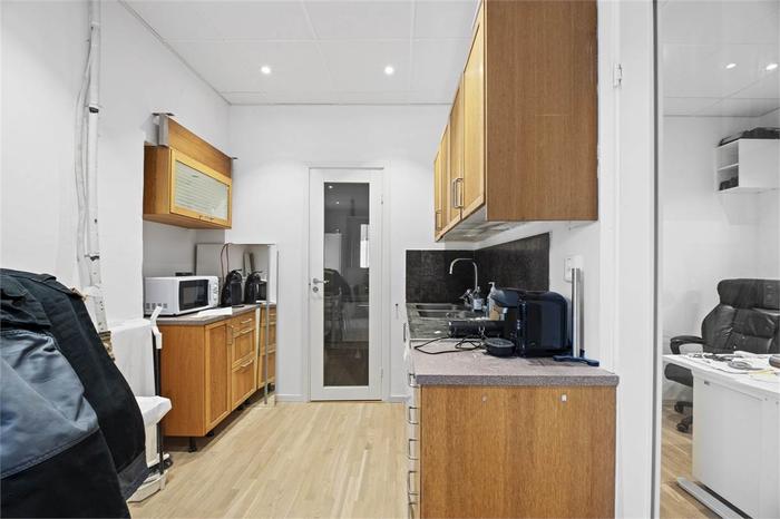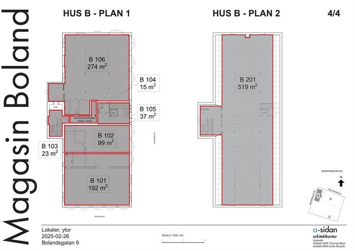 Planlösning:Lokal B102 om ca 99 kvm är yteffektiv och väl disponerad i ett rektangulärt format vilket skapar goda möjligheter till flexibel användning. Ytan lämpar sig utmärkt som lager, förråd eller för lättare verksamhet. I bakkant finns ett mindre kök, WC, pentry samt ett kontorsrum.