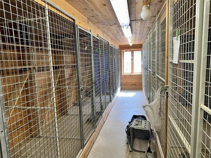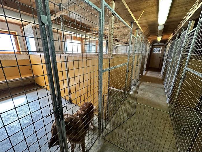 receptionsdel/mottagning samt ingång till ett duschrum för tex päslvård. Vidare in i lokalen finns till vänster kattavdelningen med förråd samt flera boxar för katterna att vara i. Rakt in i lokalen från receptionsdelen är hundavdelningen där det först är en hall med plats för hundarnas koppel och dylikt. På båda sidorna om hallen finns två hundrum med flera boxar för hundarna. Från hallen är det även utgång till den första rastgården med flera boxar om hundarna måste separeras. Från denna hage finns även utgång till två hagar med naturtomt. Till höger från receptionen finns personalrum och ytterligare ett förråd samt ett rum till för kontor eller vård av djuren alternativt isolering.