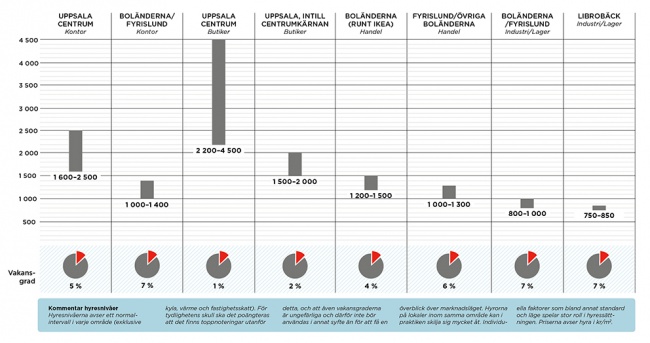 Uppsalas kontorsmarknad är fortsatt stabil och vakanserna har inte ökat trots att flertalet nya kontorsbyggnader har uppförts i centrala Uppsala. Efterfrågan avser större sammanhängande kontorsytor med modern standard, men även små kontorslokaler. Nyproduktionen har till en del tillfredsställt behovet av större kontorslokaler men fortfarande saknas alternativ för de företag som söker större sammanhängande ytor centralt i Uppsala. Nyproduktionen tillgodoser normalt sett inte den efterfrågan som föreligger avseende små kontorslokaler vilket gör att det fortfarande efterfrågas sådana lokaler.