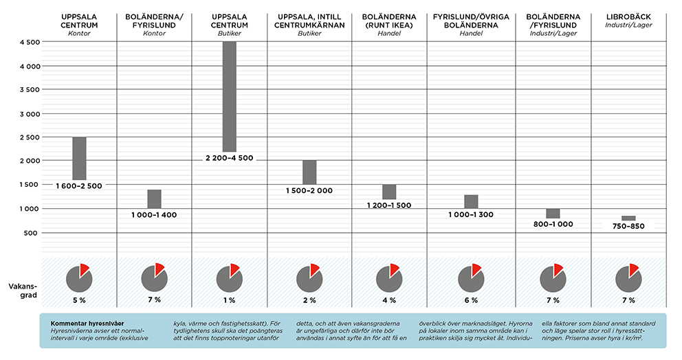 Uppsala fortsätter att växa och har en fortsatt stark befolkningsutveckling med låg arbetslöshet. Förutom den starka efterfrågan på bostäder är det efterfrågan på alla kategorier av lokaler, med en stark efterfrågan på riktigt små kontorslokaler och stora kontorslokaler samt industri- och lagerlokaler. Däremot ser vi att butikslokaler i centrala Uppsala efterfrågas något mindre.