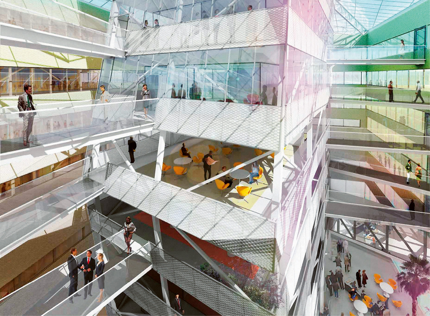 Inuti får Sjökvarteret ett stort atrium i mitten och rakt över atriumet ska det gå landgångar att gå på för att ta sig mellan kontorsytorna.