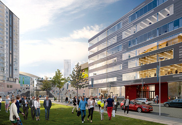 – Fastigheten kommer att få en ny, ljus fasad och de tre översta tornplanen kommer att bli som en uppstickande lykta. Att komma in och mötas av atriumet kommer att ge en härlig känsla. Alla fastigheter i Arenastaden kommer att ha sin profil. Vi arbetar med olika arkitekter i olika projekt. Det ger en levande stadskänsla.