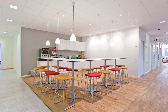 I och med flytten har arbetet omstrukturerats och effektiviserats. All säljpersonal, som är deras största personalgrupp, och alla tekniker fick flexibla arbetsplatser i stället för fasta. De är ute hos kunder stora delar av dagarna, så med den här lösningen behövs färre arbetsplatser och en mindre yta krävs. Sina personliga saker har de i var sitt skåp. Lösningen har också gjort att hela kontoret har blivit mer dynamiskt eftersom olika arbetsgrupper blandas.