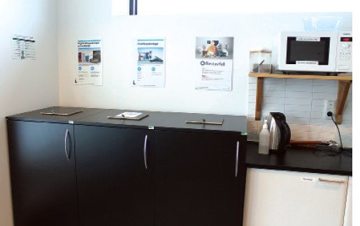 Miljön är i fokus hela tiden, men utan att det påverkar personalen särskilt mycket. Det Skanska-byggda huset är anpassat för att ha låga driftkostnader och energiförbrukningen ska vara hälften av Boverkets norm för elförbrukning. I köket står olika kärl för källsortering och runt om i huset finns behållare för pantburkar och flaskor. I garaget är det förberett med elbilsladdningsstationer och på taket växer det grönt för miljöns skull.