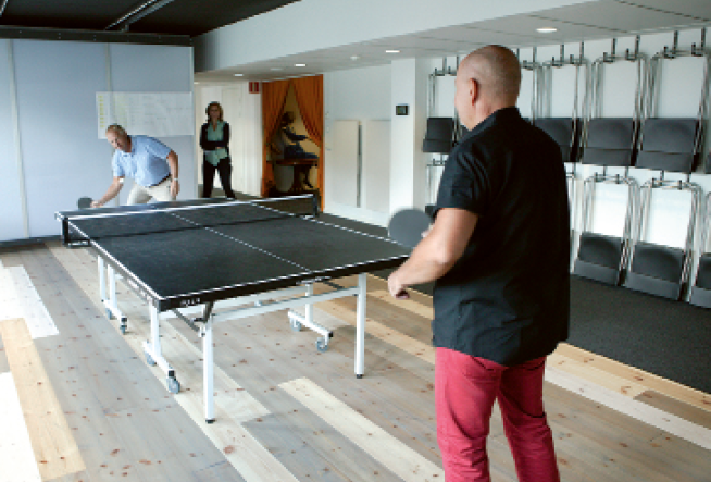 Lunchmatch. Mitt i kontoret står ett pingisbord redo för medarbetarna att ta en match.