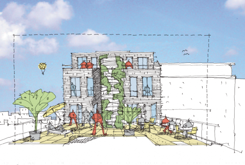 På plan fyra kommer det att finns en gemensam terrass som en naturlig mötesplats för alla i fastigheten. Och Joakim Feldt har en tanke om att även placera en street-basketplan där.
