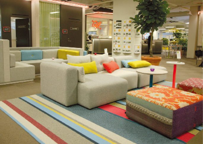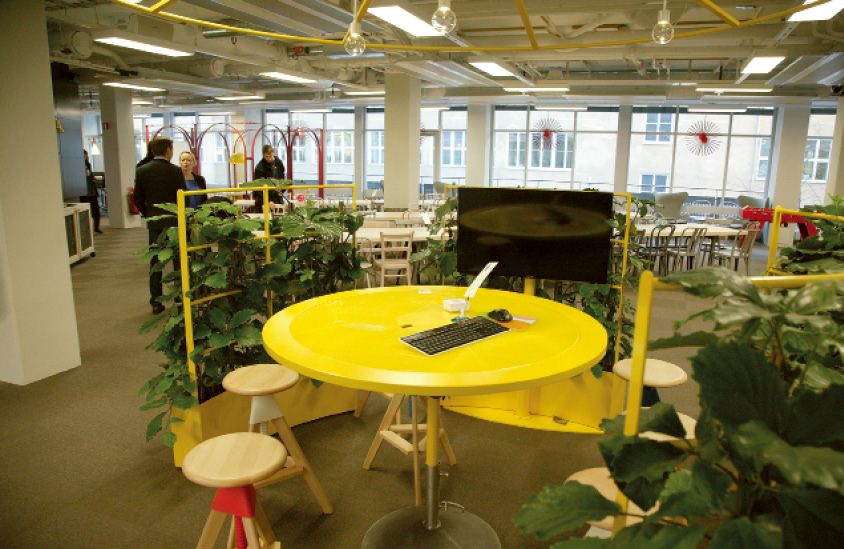 Öppet. Här finns mängder av mötesplatser och små rum för möten och konferenser. Kontoret präglas av öppenhet. Här bakom är samlingsområdet, där man vanligtvis också äter sin lunch. Alla möbler i mötes- och samlingsutrymmen är begagnade, för miljöns skull. "Det mesta är köpt på Blocket eller Bukowskis", säger Fredrik Wirdenius.