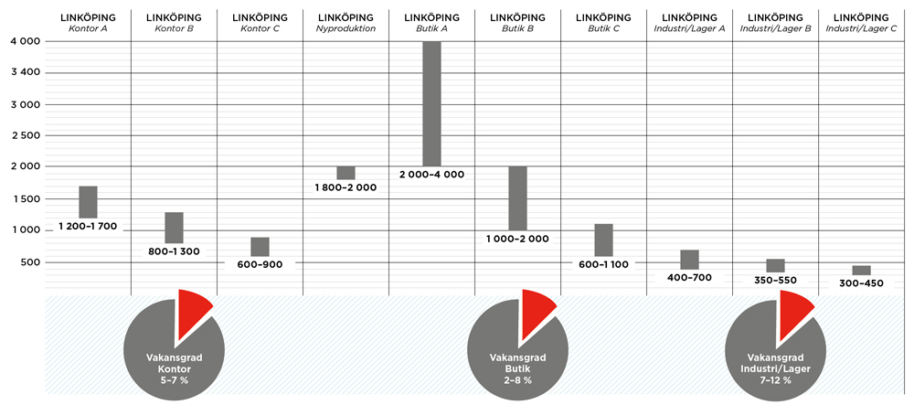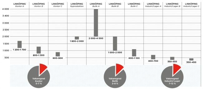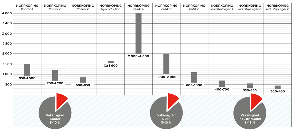 Hyrorna på kontorssidan har på senare år stigit i Norrköping. Visserligen från relativt låga nivåer. Jag tror att den trenden kan hålla i sig. Det ligger i linje med att moderniseringen av dessa ytor har tagit fart. Inom lager/industri ser vi ett stort utbud och ungefär samma efterfrågan. Här är utvecklingen av hyrorna inte densamma som inom kontor.