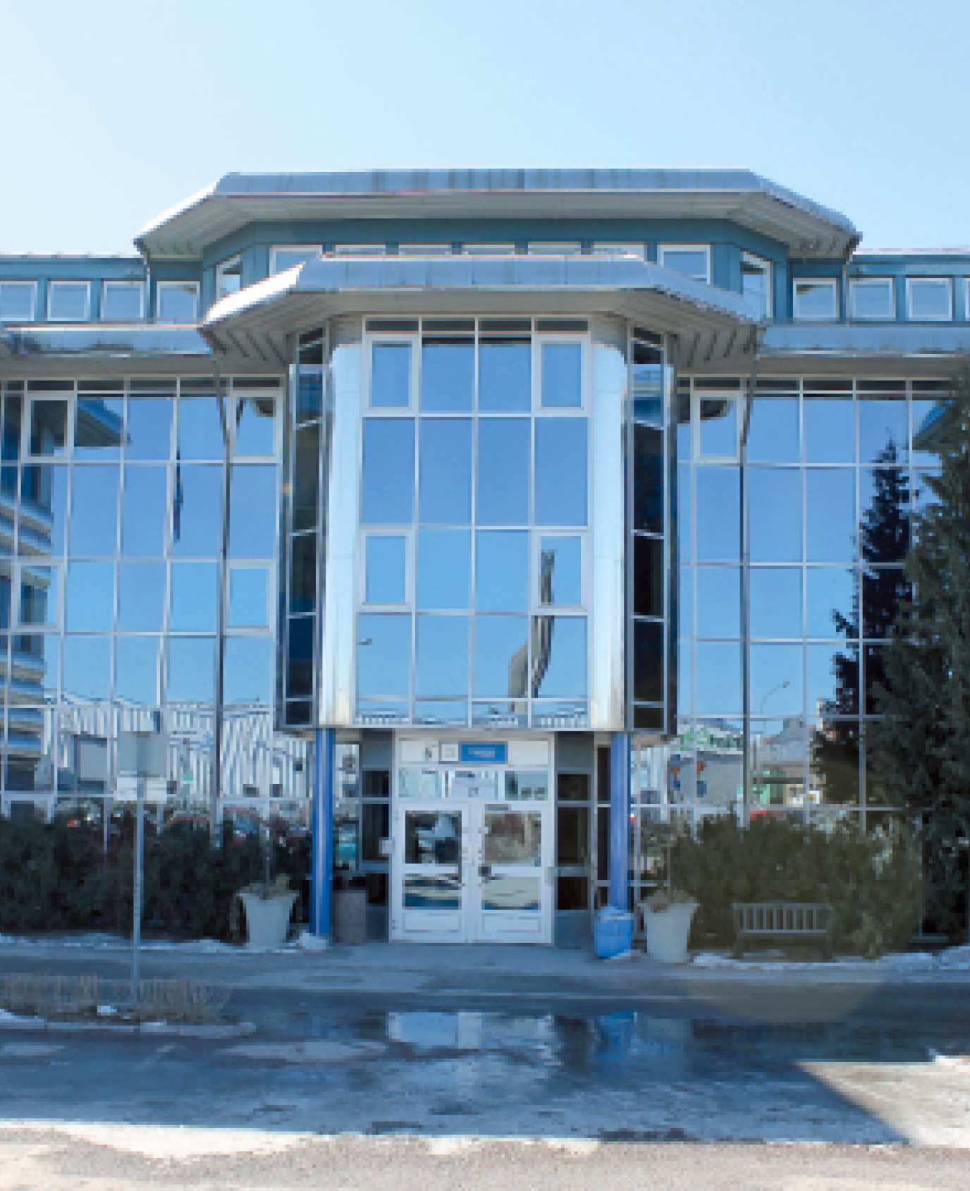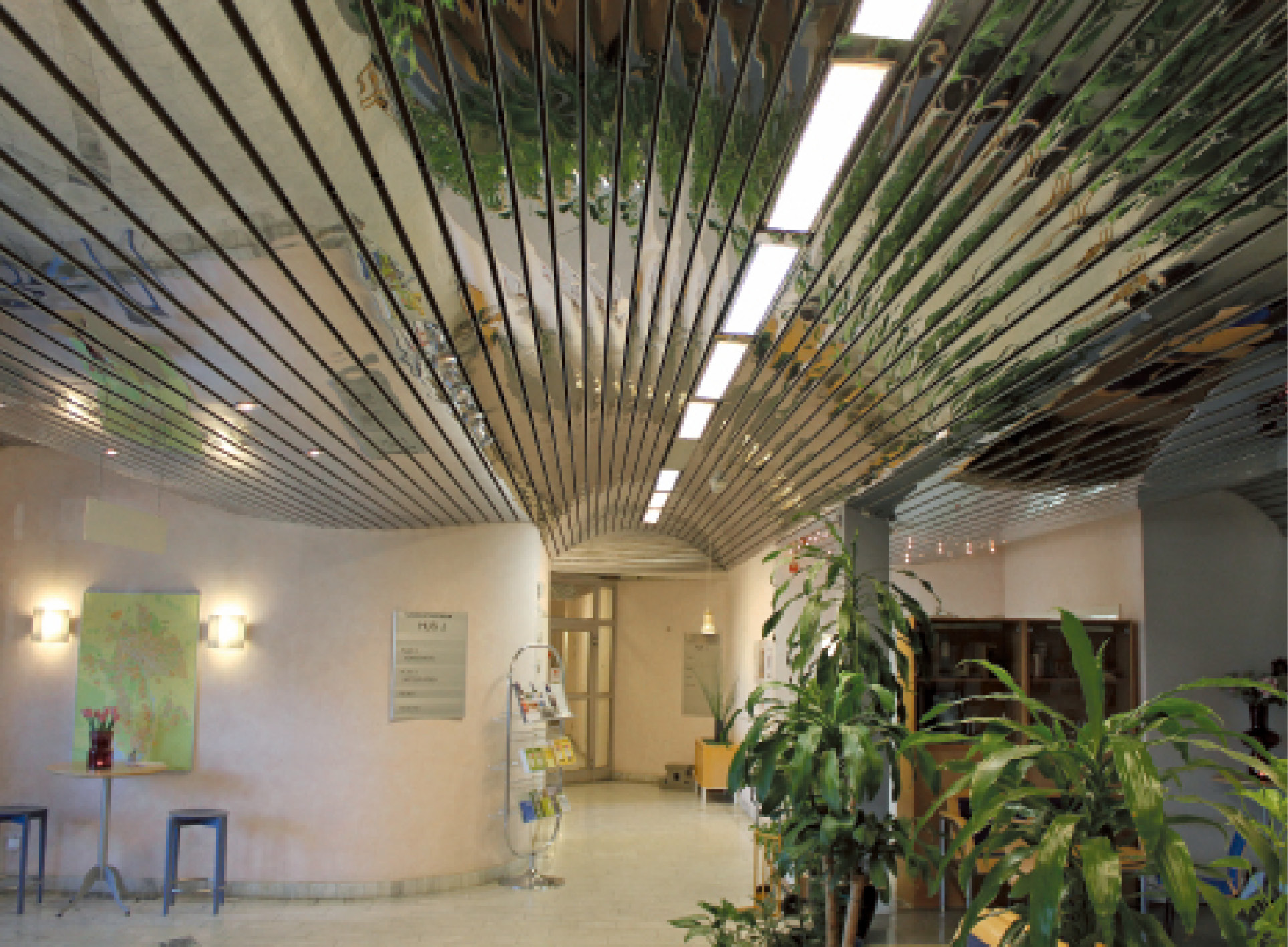 Glansigt. Den rostfria plåten är utmärkande för Kungsporten, både exteriört och interiört. Den finns i många korridorer och som här, i kommunens gamla reception i den största byggnaden.