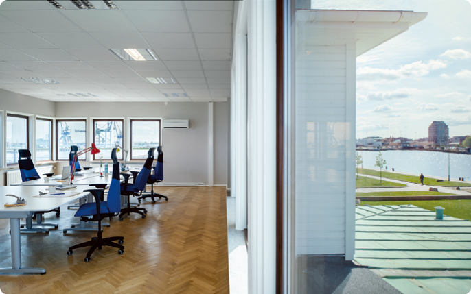 Hamnpaviljongen är fullt utrustad med ergonomiska arbetsplatser, trådlös fiberinternet, gemensam fikaplats, tre konferensrum, presentationsskärmar, videokonferensmöjligheter och tre uteplatser tillgängliga för hyresgästerna.