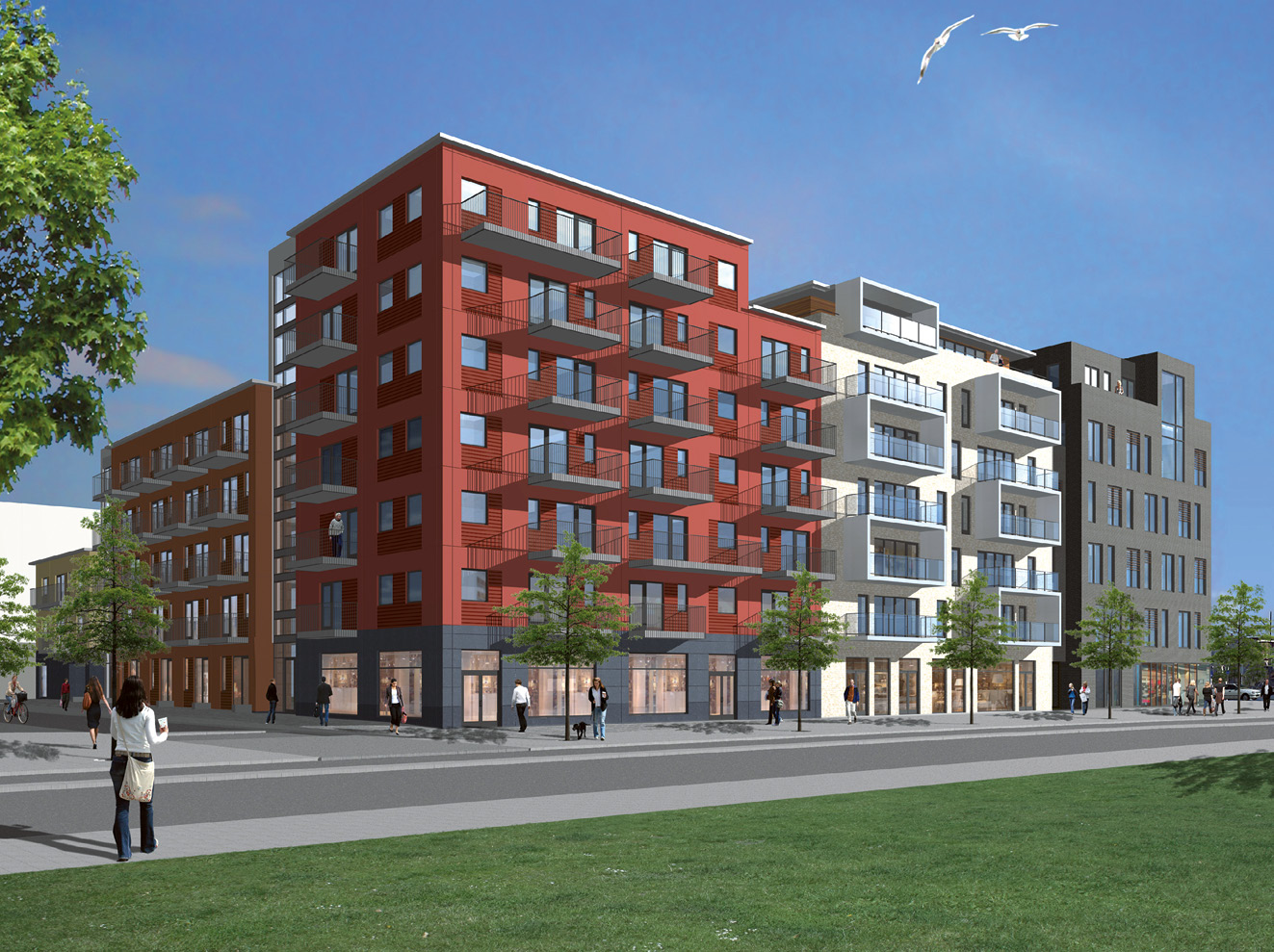 Etapp två. Det grå kontorshuset i hörnet och det intilliggande vita bostadshuset hör till Vita Örns andra etapp av Klyvaren. I mars 2016 står hela kvarteret klart.