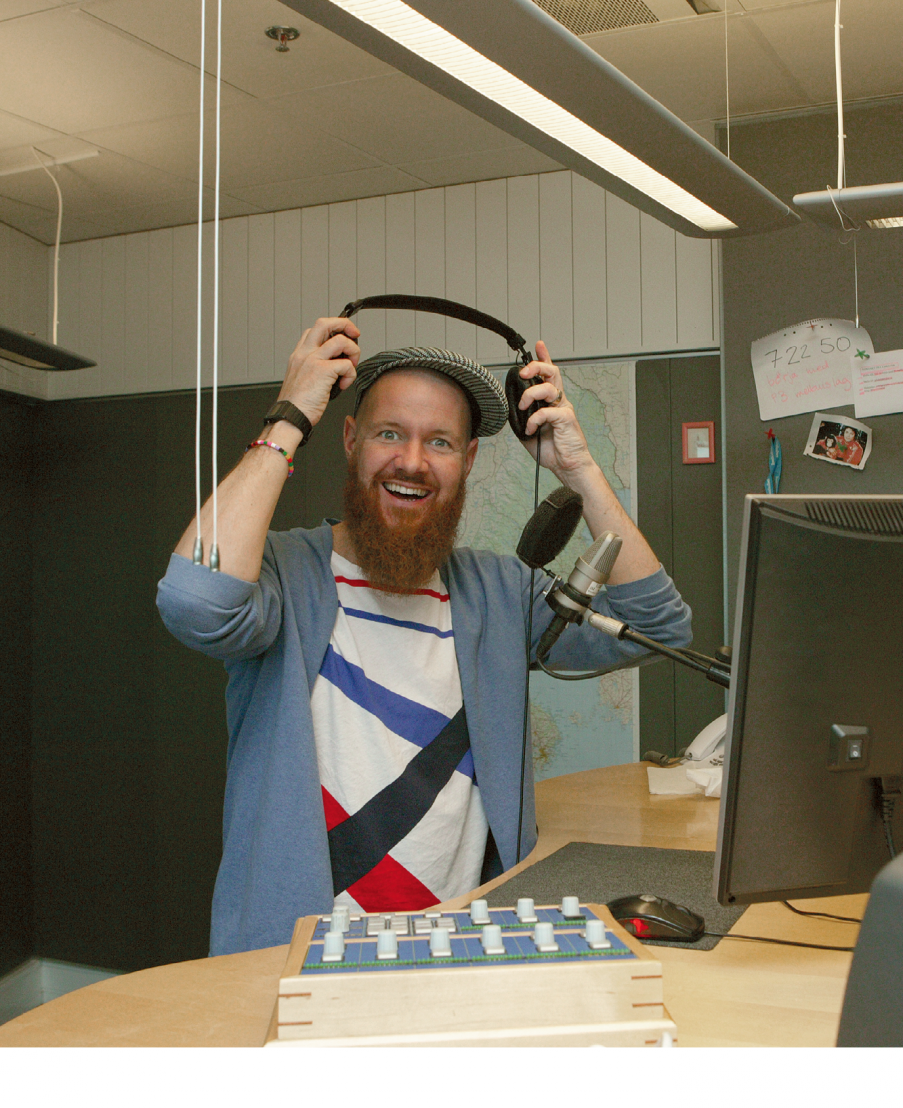 Skägget är yvigt, tofflorna veganska, och om handleden har han ett armband som dottern pärlat. Han håller på att planera för dagens program, som ska handla om kändismöten. Ämnesidéerna får han från världen utanför radiostudion, på Ica eller när han leker med sina barn. Han konstaterar därför att det för honom är ett karriärdrag att arbeta 75 procent och att han samtidigt aldrig är ledig.