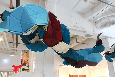 Biblioteket ligger i två våningar, det är högt i tak och stora fönster som vetter ut mot järnvägen. De gamla originalfönstren sitter kvar, men nya glas har satts innanför de gamla för att dämpa ljudet utifrån. Lena lyfter upp en stol och visar att det sitter ljuddämpande material under stolssitsen. Sen pekar hon på några blåa moln, tillverkade av filt, som hänger i taket. De har samma funktion. Smarta val som gör ljudmiljön – såväl som den visuella miljön – i biblioteket behaglig för besökare och personal.