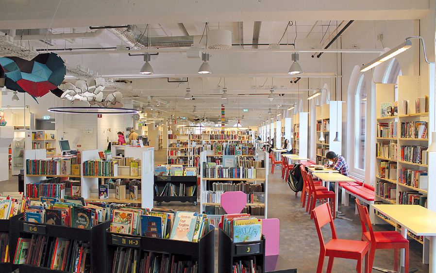 Sundbybergs stadsbibliotek är först på plats i det nya kvarteret Signalfabriken. I de renoverade fabrikslokalerna är det fokus på öppna ytor och ljuddämpande material. – Vi ville att det nya biblioteket skulle vara tillgängligt för alla, säger Lena Petersson, platsansvarig på biblioteket.