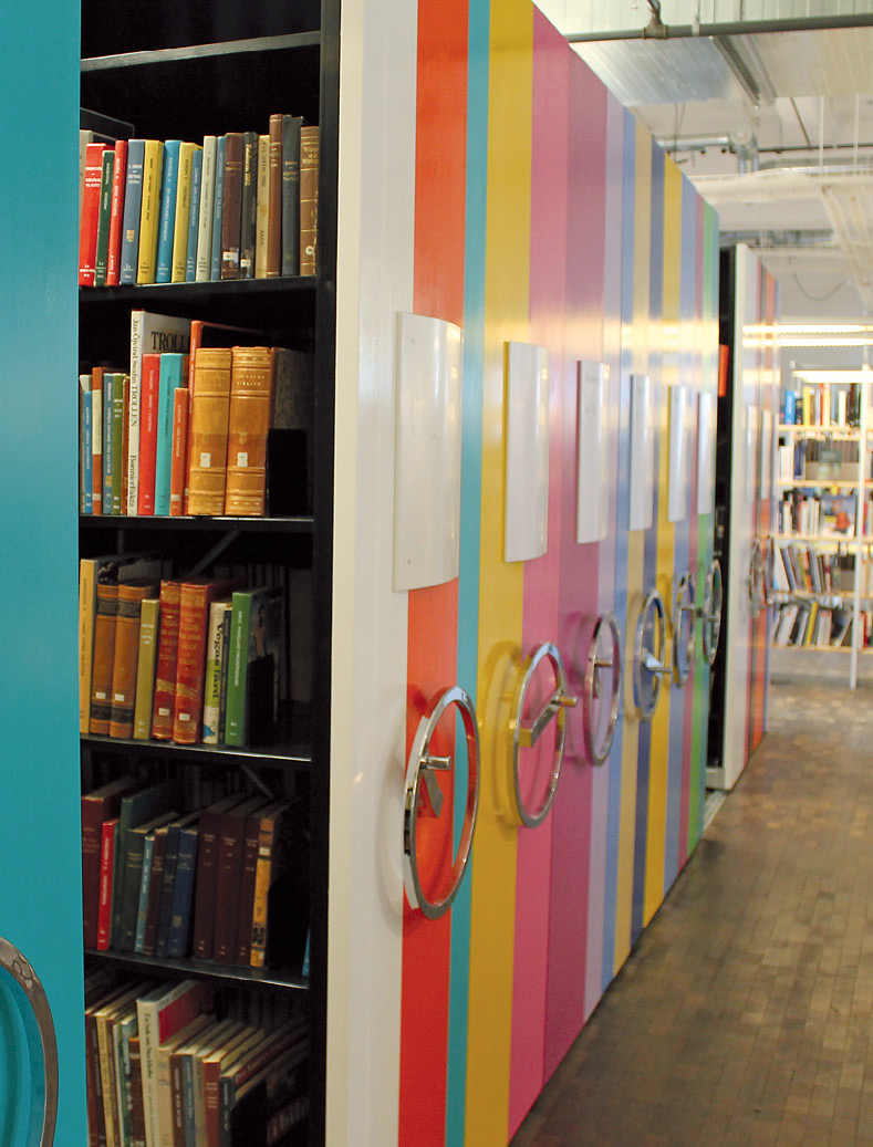 Nytt i biblioteket är också det öppna magasinet som finns på övervåningen. Det är bokhyllor uppställda på en räls som går att öppna och stänga genom att snurra på en stor ratt. Där finns de böcker som är bortsorterade från den vanliga samlingen, gamla romaner bland annat som inte lånas så mycket längre, men som det ändå finns ett värde i att ha kvar. Normalt brukar de böckerna ligga magasinerade i källaren.