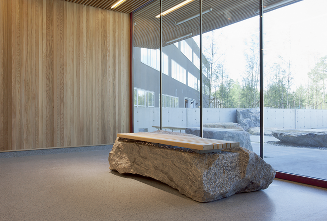 Konstnären Lars Traegdes konstverk "Inne Ute". Konstnären Lars Traegdes har samlat en grupp stenblock från sprängningsarbetena. Blocken har en praktisk funktion som skalskydd till byggnaden.