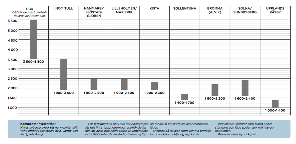 Flytten till Stockholms tillväxtområden är alltjämt stark tack vare rimliga hyresnivåer och goda kommunikationsvägar. Hyresnivåerna har inte påverkats nämnvärt av den kommande utflytten från centrala Stockholm utan tillgång och efterfrågan är tämligen balanserad vilket har lett till en svagt positiv utveckling av hyresnivåerna. Denna utveckling förväntar vi oss bestå under den närmaste framtiden.