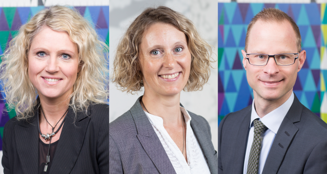 Katarina Cygnaeus, uthyrningsansvarig för Solna strand, Rebecka Yrlid, hållbarhetschef och David Johansson, fastighetschef på Humlegården Fastigheter.
