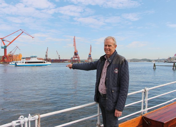 – Halvön kommer att gå 90–100 meter ut från kajkanten här, säger Lennart Hedström och pekar ut mot båtskyttlarna som går fram och tillbaka mellan Stenpiren och Lindholmen.