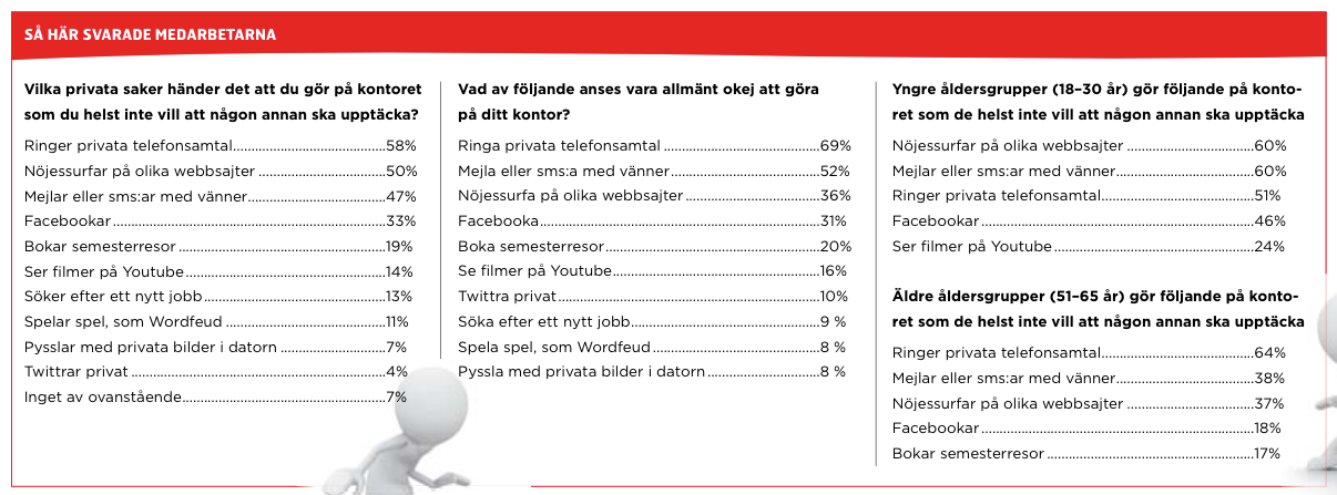 Bland dem som svarar att de inte gör privata saker på kontoret anger en majoritet att skälet är att de inte har tid. En fjärdedel svarar att det inte är schyst mot arbetsgivaren och lika många att det är omoraliskt. Kvinnor är mer moraliska än män, 30 procent av kvinnorna ägnar sig inte åt privata saker på jobbet. Motsvarande siffra för män är 20 procent.
