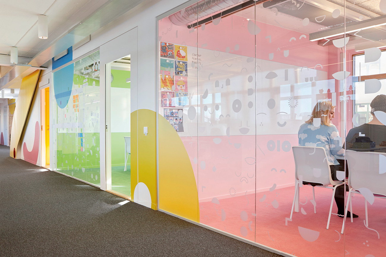 Hon menar att det har varit viktigt att de anställda fått sätta sin egen prägel på sina arbetsplatser. Därför har de separata arbetsplatserna gjorts i svart och vitt, medan de gemensamma ytorna är minst sagt färgsprakande.