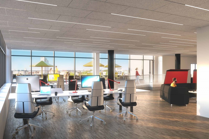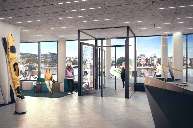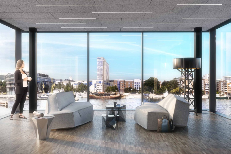 På taket byggs flera terrasser som lämpar sig väl för till exempel personalrekreation eller representationsytor. Eller för att bara ta en kopp kaffe och njuta av utsikten. För Stockholm Seaside är temat Vatten och inspirationen är hämtad från platsen. Entrérummet blir ljust och rymligt, perfekt för varumärkesbyggande.