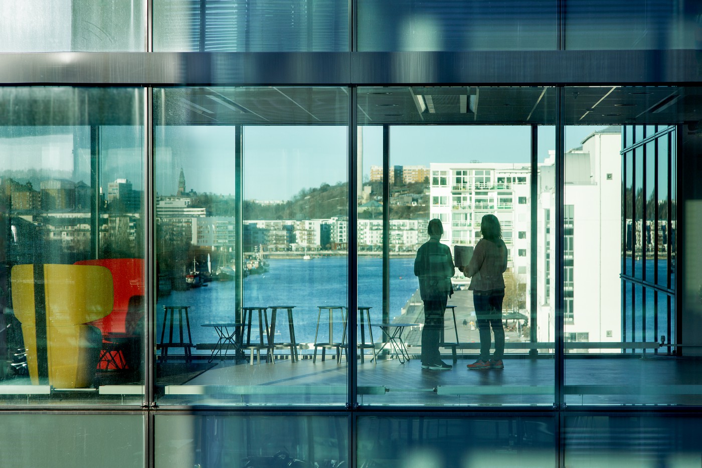 Ulrika Ahlgren och Anette Hall under en av IIS 'lyktor' - en allmän yta med utsikt över kajen och vattnet.