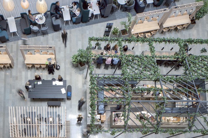 Byggnaderna rymmer fyra atrier och det är från dem all kommunikation utgår från. Varje atrium har sin specifika funktion: det första ska uppmuntra till spontana möten, det andra till flexibla sammankomster, det tredje har en vardagsrumskaraktär och det fjärde fungerar som ett öppet alternativ till den egna arbetsplatsen.