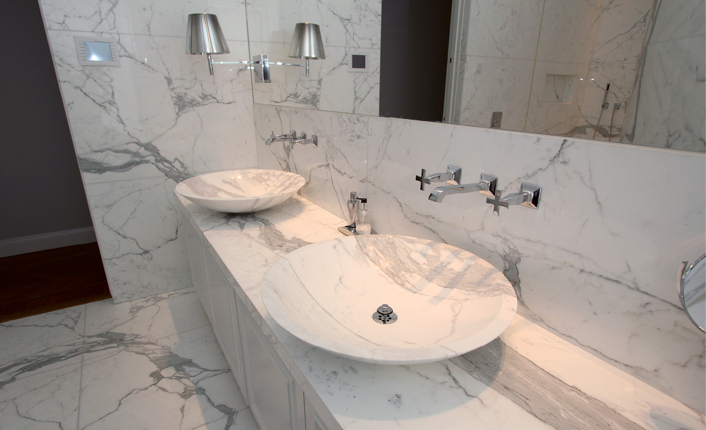 Ett badrum helt gjort av vit statuariomarmor från Italien. Alla bitar tagna från samma stenblock, ihoppusslade för att låta stenens gråa mineralådror löpa i linje med varandra.<br /> Projektet gav Mölndalsbaserade Stencentrum pris för världens vackraste marmorbadrum 2013