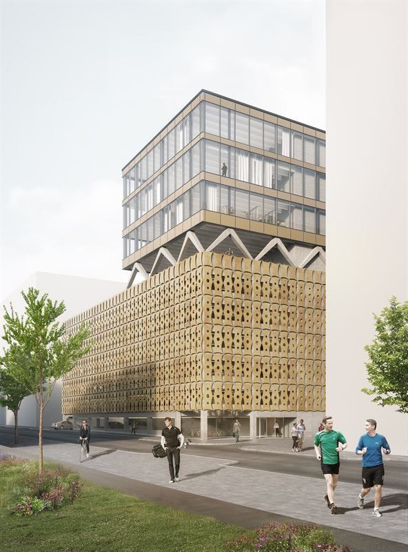 Fastigheten inrymmer elva våningar och den innovativa arkitekturen och gestaltningen speglar dess funktioner. De tre översta våningsplanen med kontor och gym ger intrycket av att sväva ovanpå parkeringshusets åtta våningar med 475 parkeringsplatser. Arkitekt är Roger Spetz från Scheiwiller Svensson Arkitektkontor.