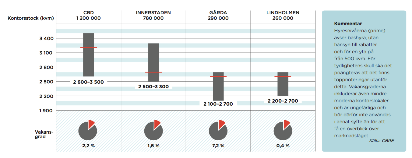 Avslutningsvis ser vi att hyrorna har börjat krypa uppåt och att flera fastighetsägare har anpassat hyresnivåerna till den rådande vakansgraden. Tidigare fanns det en gräns på topphyror runt 3 500 kronor per kvadratmeter och år, medan vi nu ser flera avtal tecknas närmare 4 000 kronor per kvadratmeter och år.