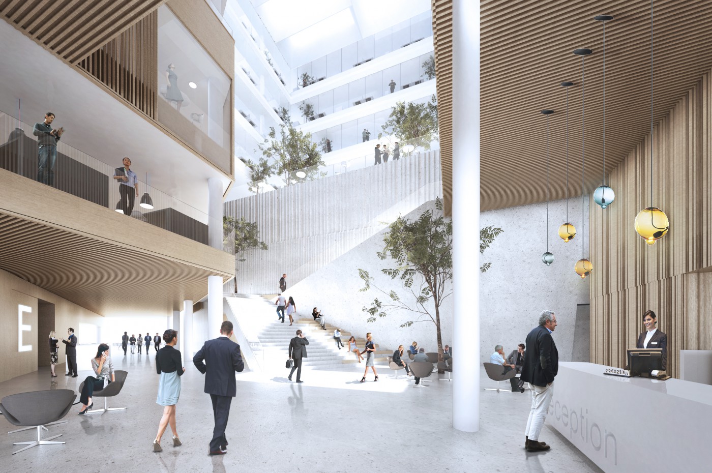 – Det blir verkligen hjärtat i huset och en möjlighet att skapa synergier mellan företag och människor. Det ska finnas goda mötesmöjligheter och bra mat med något för alla, säger Camilla Skogsberg. Ett plan kommer att rymma en 300 kvadratmeter stor terrass som blir hyresgästernas trädgård. Här ska man både kunna ha möten och vara en plats för avkoppling.
