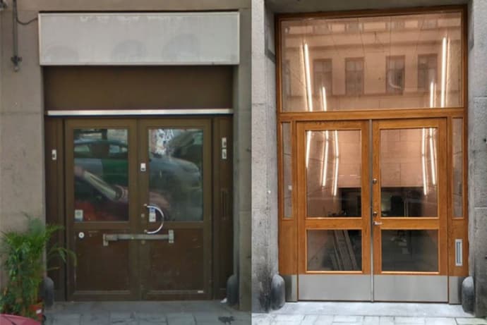 I samband med bytet gjordes flera åtgärder. Dels flyttades dörrpartiet ut närmre trottoaren. Dels togs aluminiumplåten bort helt för att ersättas av stora glaspartier och vackra ekramar. Ek är ett levande och långsiktigt hållbart träslag. Tillsammans med de nya glaspartierna har dagsljusinsläppet ökat påtagligt i hela entrén. Den nya dörrens lås har också de säkerhetsklassningar som gäller för dagens försäkringskrav utan att påverka estetiken. Tillsammans har åtgärderna inneburit en stor förvandling.