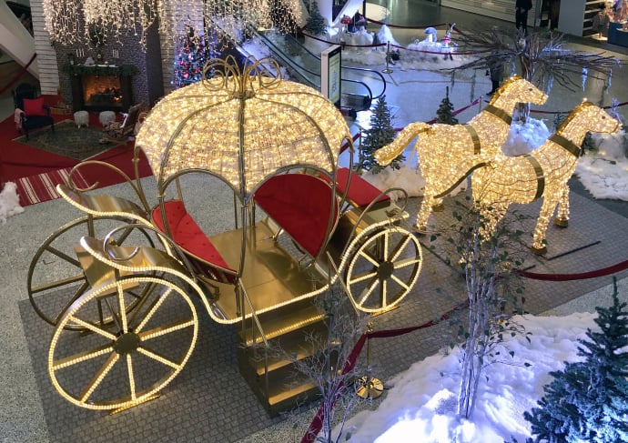 I Centralhallen, mitt i Frölunda Torg, har alltså Askungens fina vagn parkerat med ett hästekipage och en pumpavagn på byggts upp. Hela ekipaget är 14 meter långt och pumpavagnen fyra meter hög. Totalt är det 6000 ledlampor som glittrar över hela vagnen och hästarna.