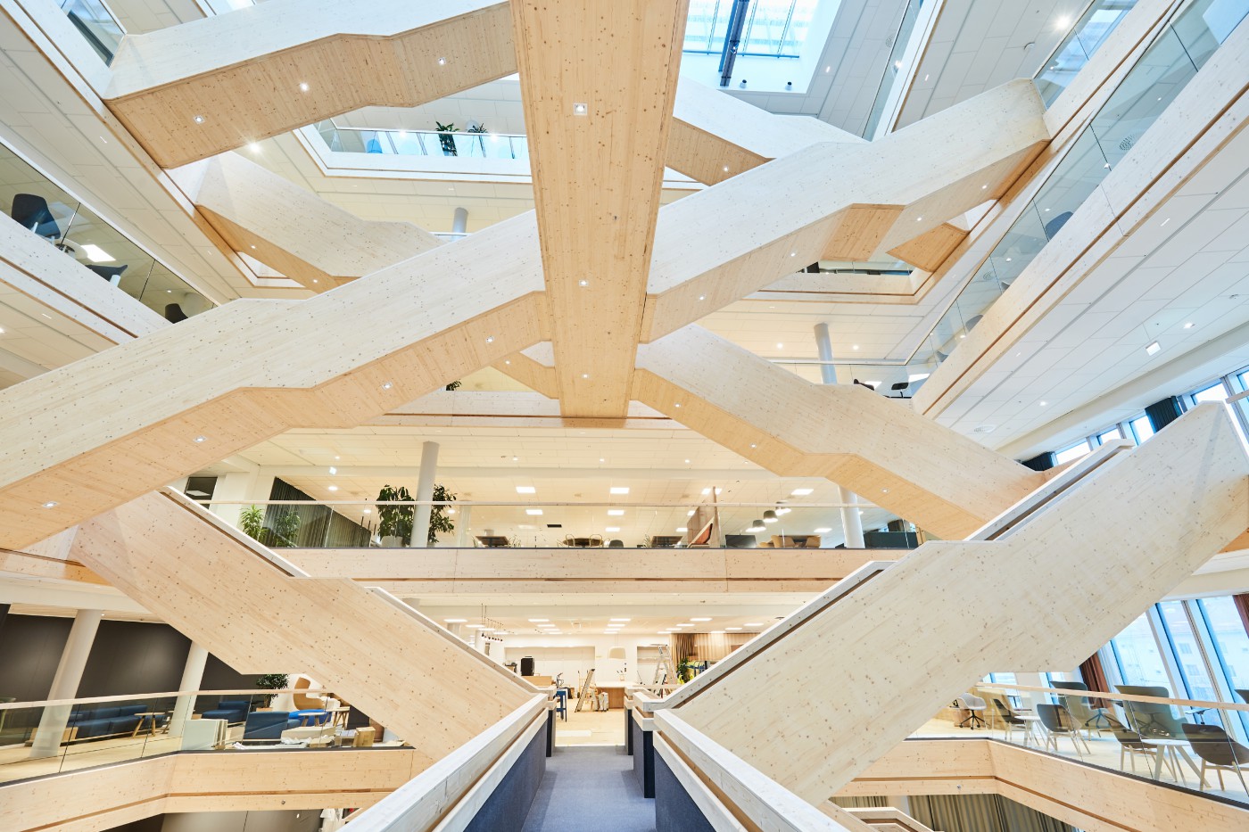 – Entréplanet är öppet för allmänheten och har en visuell koppling upp i huset med öppningar i bjälklaget och rum med dubbel takhöjd. Genom huset sträcker sig två atrier, gestaltade i massivträ. Det första atriet är generöst och luftigt med en skulptural trappa som genererar rörelse och spontana möten. Det andra atriet är mer intimt med mindre mötesplatser och pausytor, säger Pi Ekblom, arkitekt White.