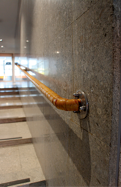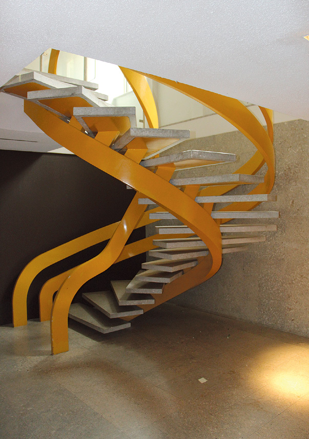 Den gula trappan vid entrén leder upp till andra våningsplan och innergården som också ska rustas upp.