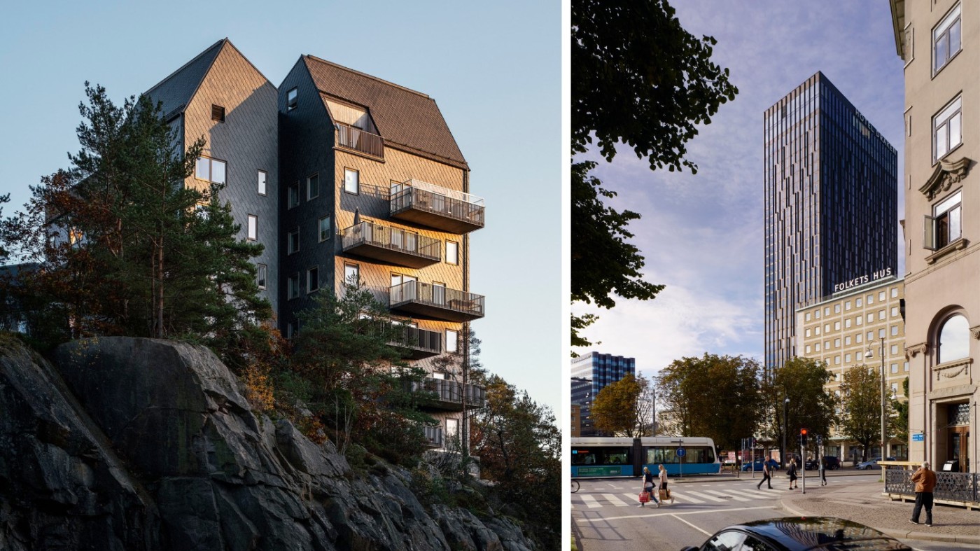Uggleberget i Nya Hovås och Hotell Draken i Göteborg av FOJAB respektive Erséus Arkitekter. Nu blir kontoren ett. Foto: Felix Gerlach och Bert Leandersson